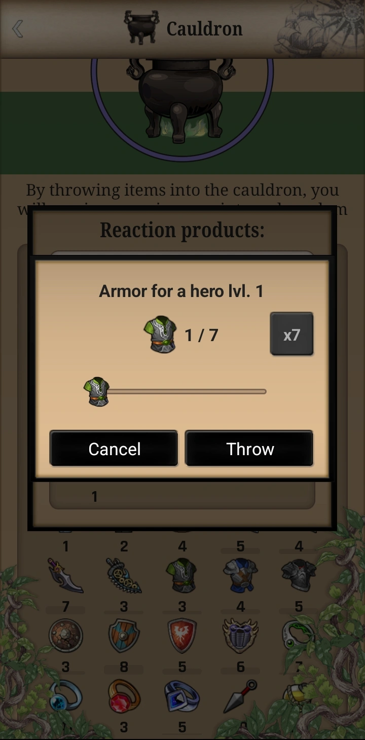 The first pop-up asks the player how many Armors for a hero lvl. 1 do they want to throw, while the second pop-up (behind) shows reaction products of the previous throw.