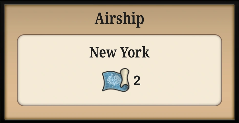 Each city has its own unique buy/sell items and travel time. At Airship lvl. 1, all cities offer up to 2 items to buy. At Airship lvl. 2, the upper limit of the amount of items the player can buy increases to 4. With Titanium longerons technology the player can buy up to 5 items. The number of resources that are traded for these items scales proportionally with the amount being bought. Items on every route can be adjusted, but the 10 Coin expense is the same no matter the amount bought. Only the Paris route can't be sent for less than 40 Coins.
