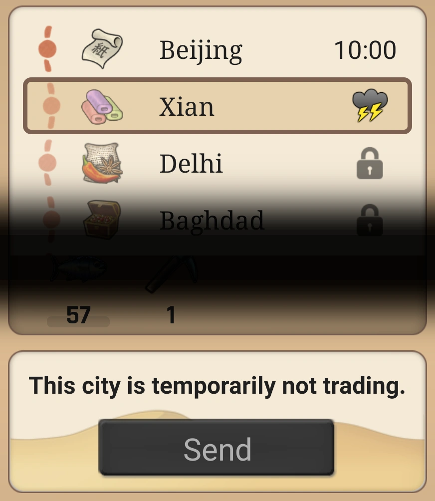 Selecting a closed city: "This city is temporarily not trading.".