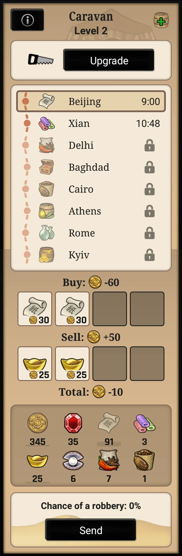 To send the caravan on a mission, a destination city has to be chosen first. Depending on the size (level) of the caravan, the player can then select up to 4 items they want to purchase and up to 4 items they want to sell in the chosen city. If expenses are greater than income, the player must have enough Dinars in warehouse to cover the difference, or the caravan won't go. If income is greater than expenses, the surplus of Dinars will be added to player's warehouse when the mission has ended (successfully). If the player has enough Dinars and they want to buy with just Dinars, select no items and just tap "Send".