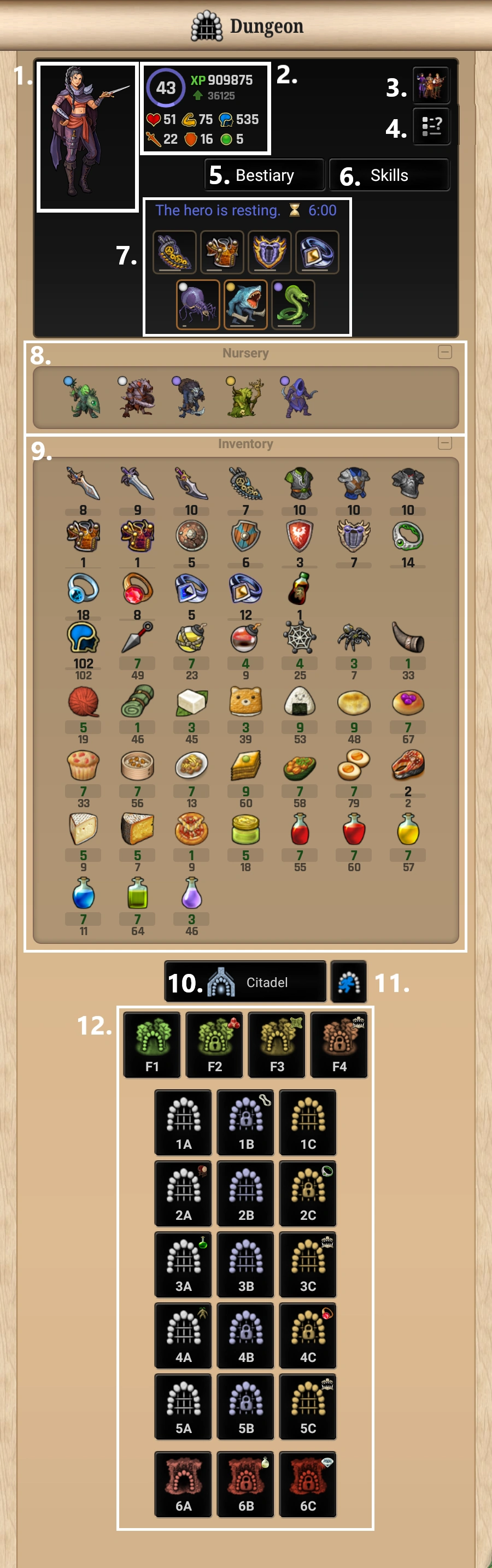 By entering the Dungeon (building) the player is either taken to the Dungeon screen (if a hero is already exploring it) or prompted with a menu. Some dungeon levels don't show, if they are not "found" yet (forest) or they are not built yet (citadel).