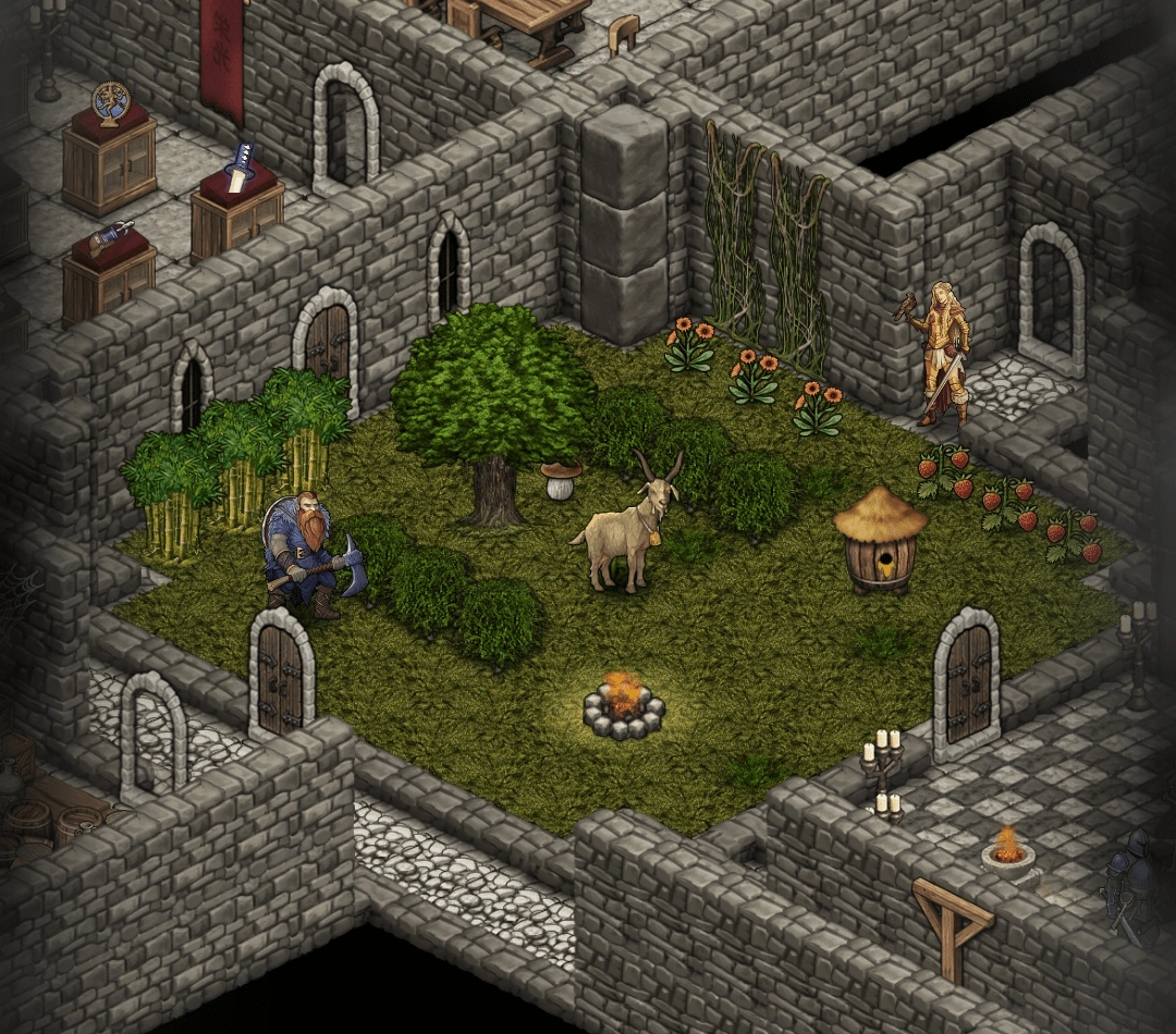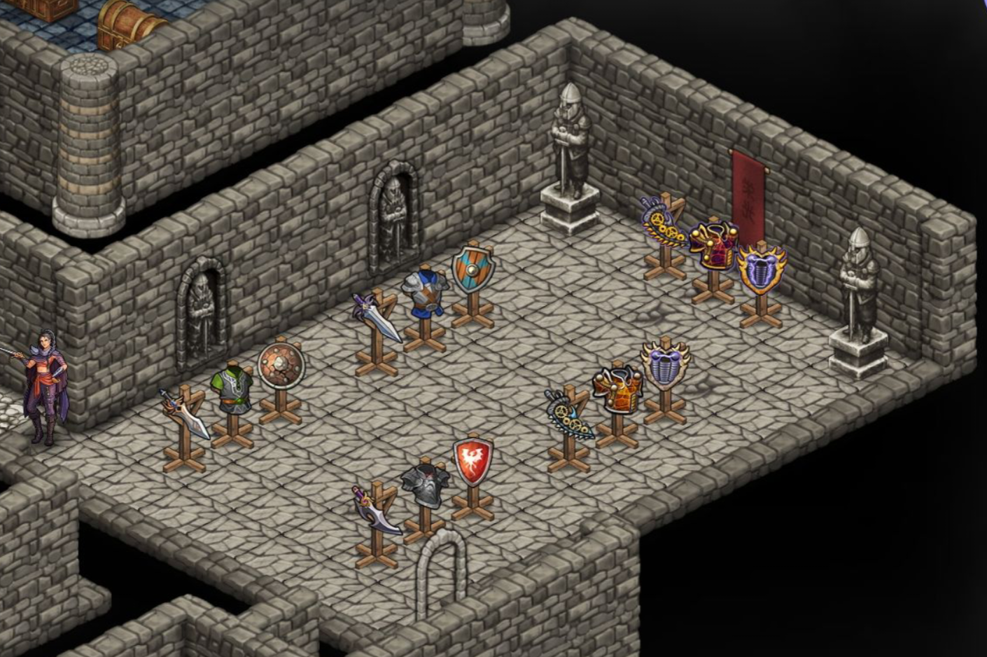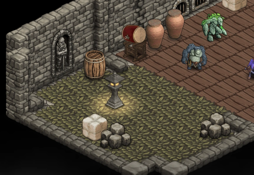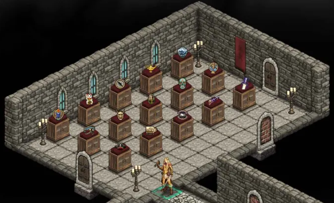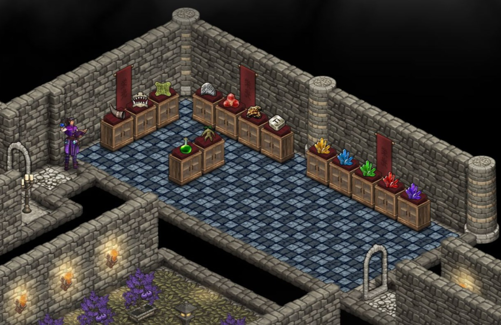 In some of the rooms there are places with a colored dot above a tile (or several). Dots of the same color denote a single collection spanning several items. Interaction with these gives the option to spend resources, a collection of the specific item, once in order to gain a benefit (e.g. spending 1 Very old scroll for +10 MP max or 3000 coins for +30% inventory capacity increase). Resources cannot be provided partially. After spending the items, the collection is now permanently exhibited in the citadel. Unlocking new rooms by upgrading the citadel grants access to further collections.