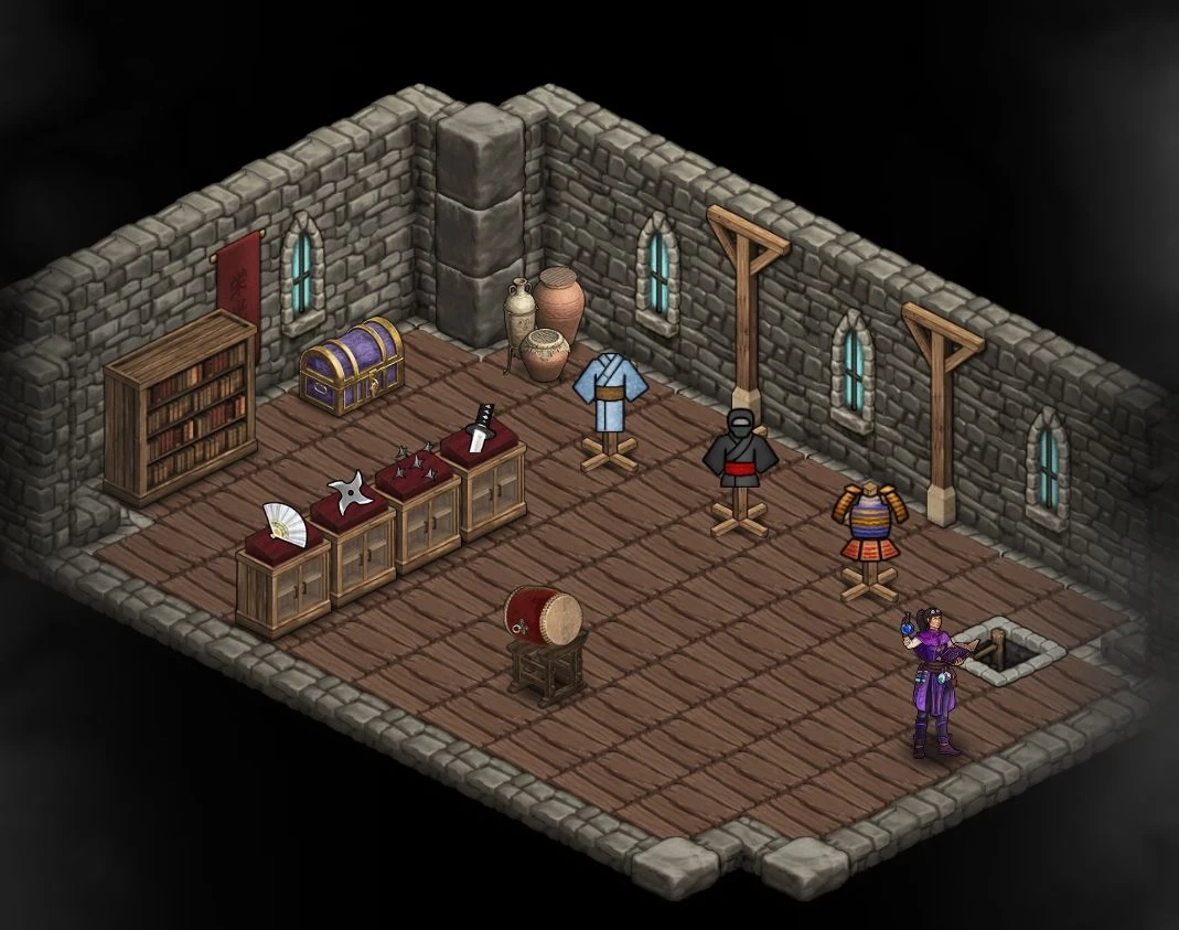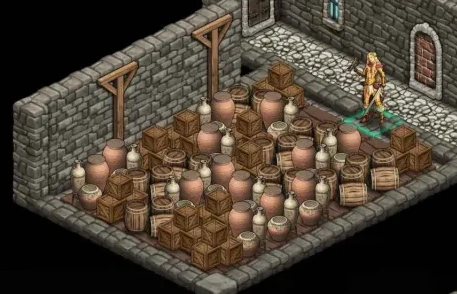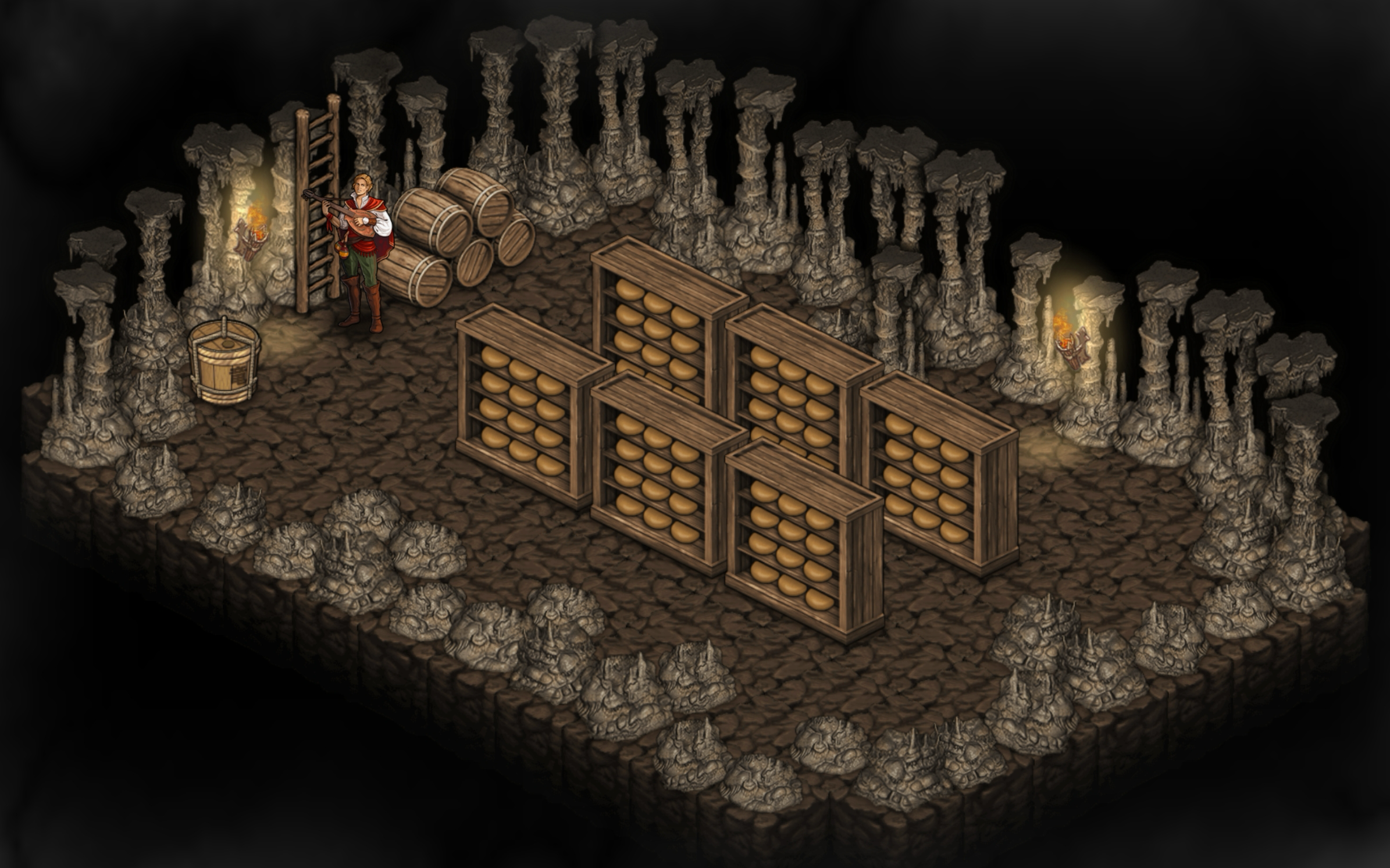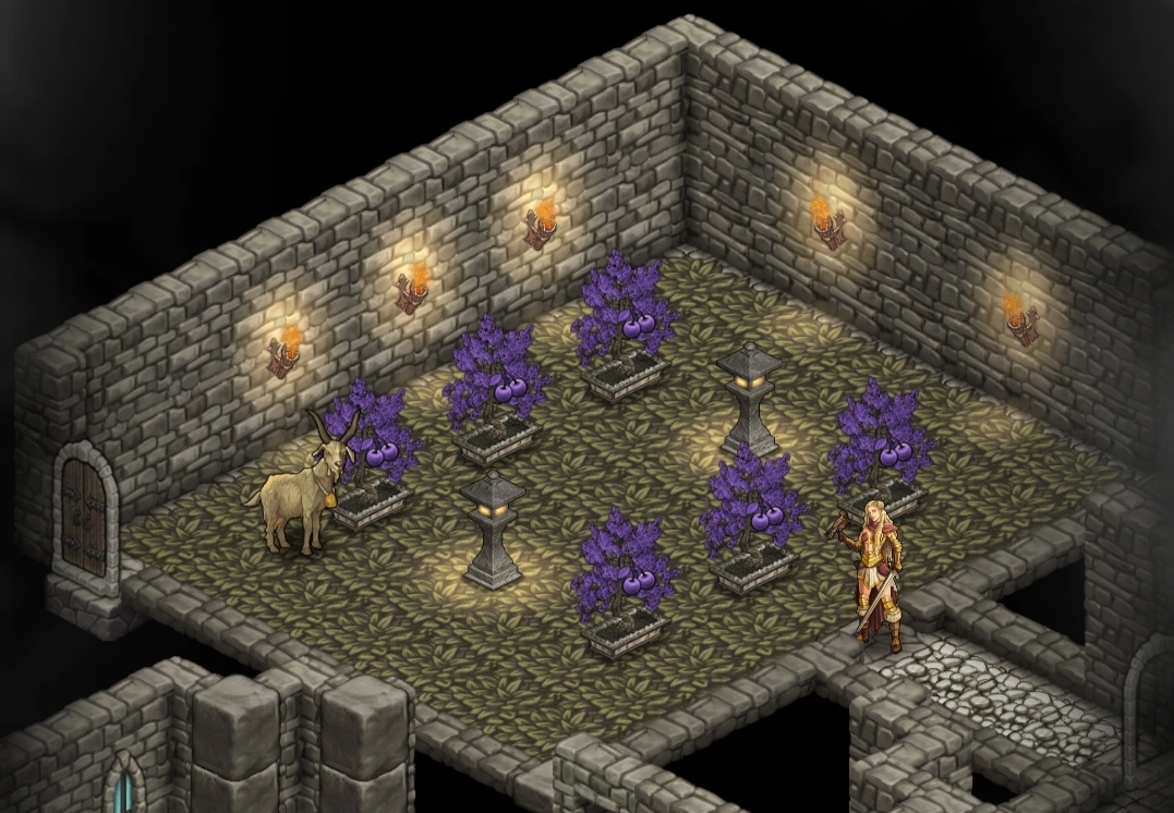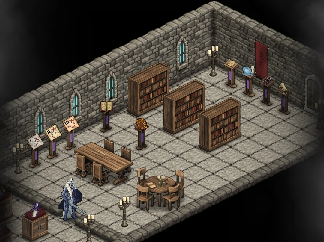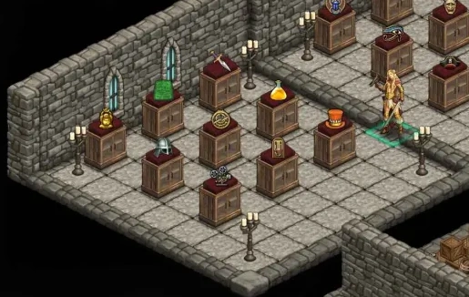 In some of the rooms there are places with a colored dot above a tile (or several). Dots of the same color denote a single collection spanning several items. Interaction with these gives the option to spend resources, a collection of the specific item, once in order to gain a benefit (e.g. spending 1 Very old scroll for +10 MP max or 3000 coins for +30% inventory capacity increase). Resources cannot be provided partially. After spending the items, the collection is now permanently exhibited in the citadel. Unlocking new rooms by upgrading the citadel grants access to further collections.