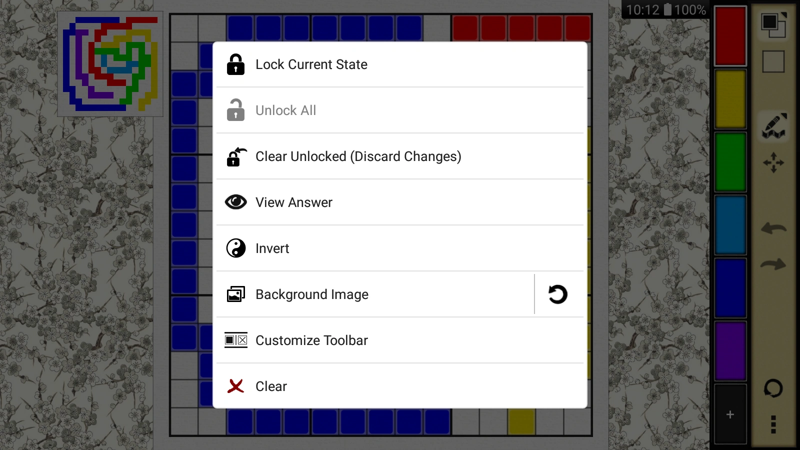 This Zen menu is similar to the Zen menu when solving nonograms (see Zen menu in User interface).