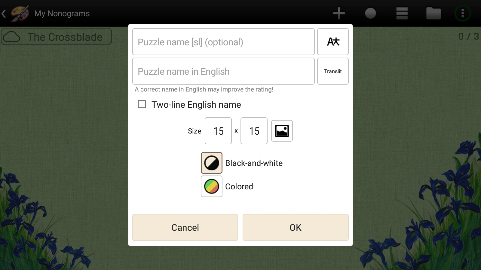 Opens the starting menu which has the same option (puzzle name, translate, size, etc.), but with one difference: the add background is replaced with the crop button which when pressed crops the nonogram to a size of colored cells. (If you've selected a 15x15 size, but colored only a 6x7 area, this button crops the 15x15 area to a 6x7 area which you colored.) |