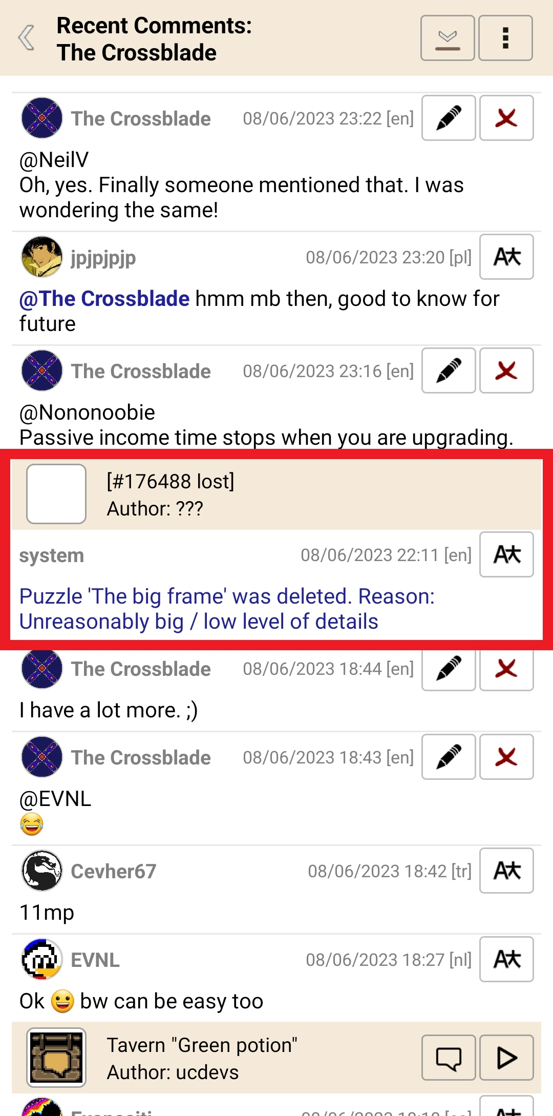 If a nonogram is deleted, a system message shows in Recent Comments of the author. The message is only visible to the author of the nonogram.