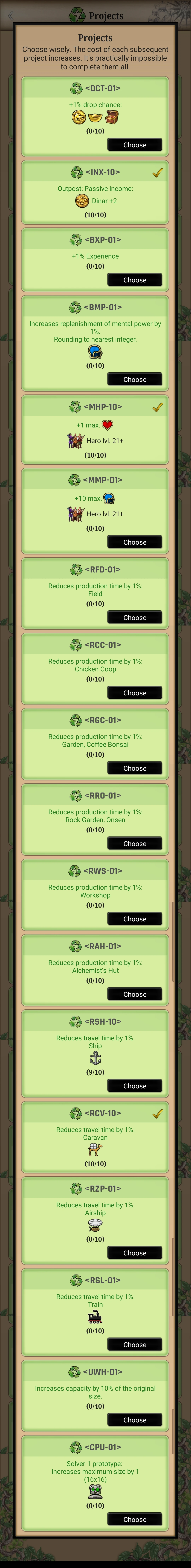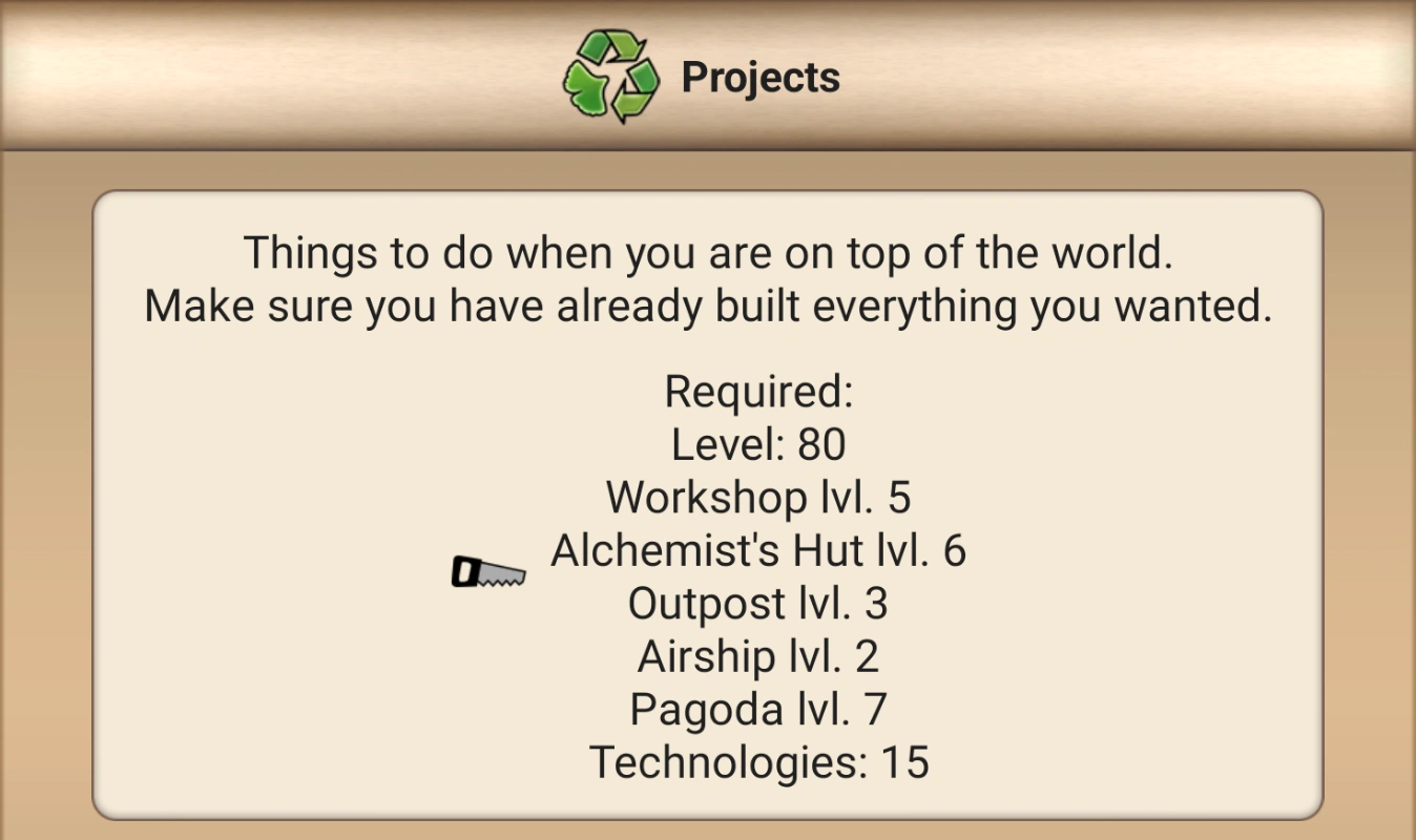 The Projects tab unlocks by reaching a certain progress point in the guild. Projects are little boosts, which require a lot of resources. These small boosts include, but are not limited to, item drop rate increases, item/experience points/Mental power boosts and production boosts. Projects are aimed for veteran players to "dump" all their resources in. Projects are meant to be completed slowly and after Technologies. Because of their mechanics (each Project requires an additional investment compared to the last completed), the player must think carefully about the order in which to learn them.