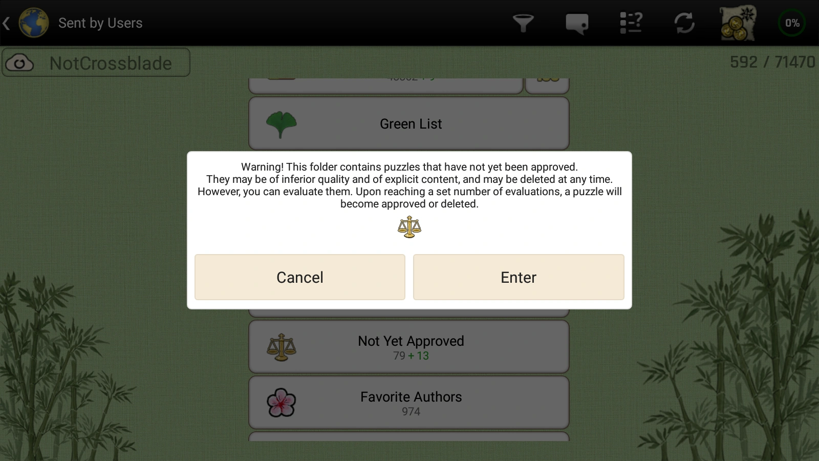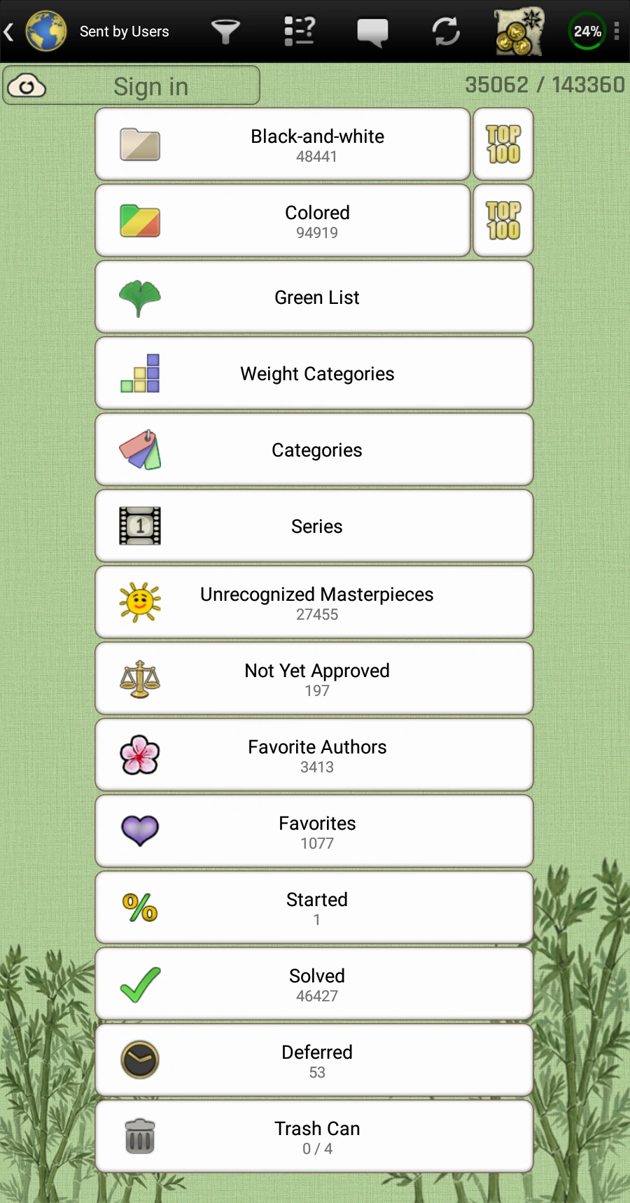 Green List - this folder contains nonograms, which the player didn't put in the "Trash Can" and nonograms which the player didn't put the author of the nonogram in the "Trash Can". The folder is customizable and always filters nonograms by the last set filter (the filter set by tapping on the "gingko leaf" icon). This folder can also be used as a second filter.