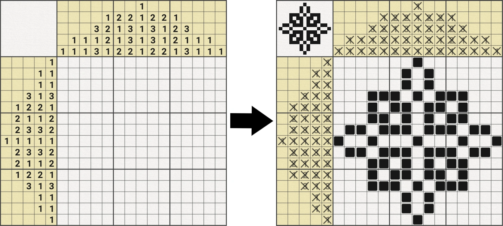 (yellow dot icon). You will notice these nonograms right away. Symmetrical nonograms are fairly easy to solve, once you recognize them. Some nonograms are only symmetrical in one area (e.g. the bottom half of a vertically symmetrical nonogram).