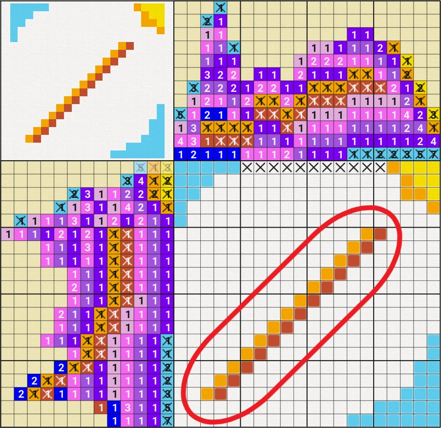 If the player doesn't want to lose loot, they can fill the first column and row with crosses and the assist tool will highlight trivial lines (requires "Highlight errors" enabled). Trivial lines can then be marked with dots (or other marks), crosses deleted and trivial lines manually filled.