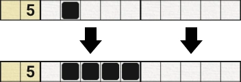 This technique is used when you have one or more boxes near the border or a cross. Then you can "spread" that box away from the border or cross depending on how big the clue is. Example 7: You have a clue of 5 and a box on the 2nd square. You can put boxes on the 3rd, 4th and 5th square, because the 5 can only go on one square to the left.