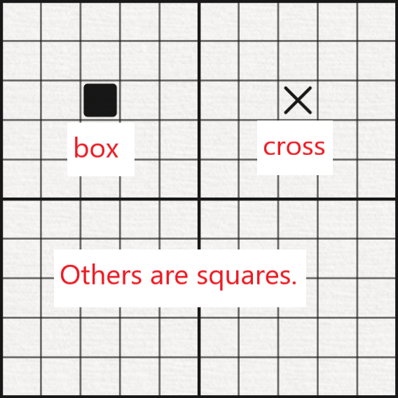 These techniques are explained on a 10x10 grid. A "square" (sometimes also called a "cell") is an empty space on the grid, which isn't marked yet. A "box" is a square colored black. A "cross" is a square which 100% isn't colored.