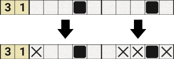 You put crosses where the boxes cannot possibly be. Example 4: You have a clue of 3-1 and 2 boxes on the 4th and 9th square. Then you know that the right box is going to be 1 and the left box is going to be a part of 3. You put crosses on the right and left side of the right box. Then you look where the 3 can go and put crosses where it can't. So you put crosses on the 1st, 7th, 8th and 10th square.