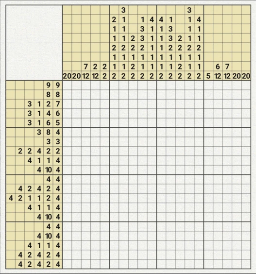 Example: If we split the nonogram (image below) in the middle (vertically), we have the same clues on the right and the left side - just mirrored. We can safely assume that the nonogram is symmetrical (vertically). If we use some logic, we can fill the middle of the nonogram - so it's symmetrical. We can also "split" the clues on the left into two - one for the left and one for the right side. A symmetrical nonogram only requires "actual" solving for one side - the other side can be logically "copied".